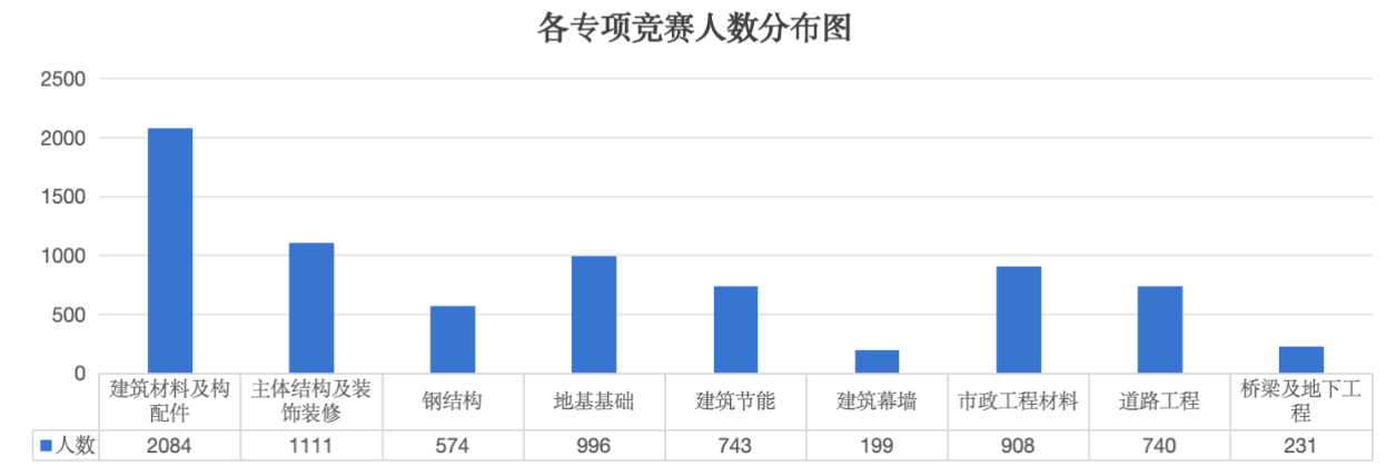 本次竞赛报名8701人次,实际参赛人次为7586人次,涵盖以下九大专项:建筑材料及构配件检测专项2084人,主体结构及装饰装修检测专项1111人,钢结构检测专项574人,地基基础检测专项996人,建筑节能检测专项743人,建筑幕墙检测专项199人,市政工程材料检测专项908人,道路工程检测专项740人,桥梁及地下工程检测专项231人。