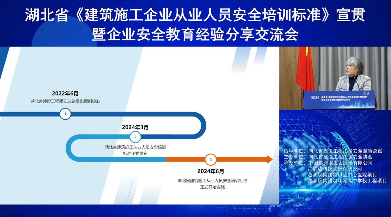 湖北省地方标准《建筑施工企业从业人员安全培训标准》(DB42/T 2219-2024)编制工作由省质安总站牵头,9家单位共同参与,经过反复讨论修改,于今年6月1日正式实施。该标准明确了施工现场安全教育的程序及要求,将施工现场安全教育规范化、标准化,形成一套完整的施工现场安全教育体系。会上,对该标准出台的背景、意义及工作过程作了介绍,围绕该标准的内容及条款进行了详细解读; 葛洲坝集团等公司围绕企业安全生产教育培训举措、数字化安全培训管理作了经验交流。