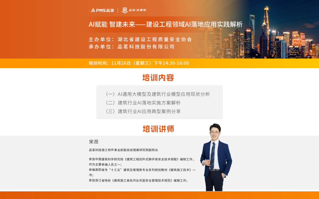 培训特邀品茗科技施工软件副总经理兼研究院副院长宋昂授课,内容涵盖了AI通用大模型及建筑行业模型应用现状分析、建筑行业AI落地实施方案解析、建筑行业 AI应用典型案例分享三个层面进行了深入讲解。